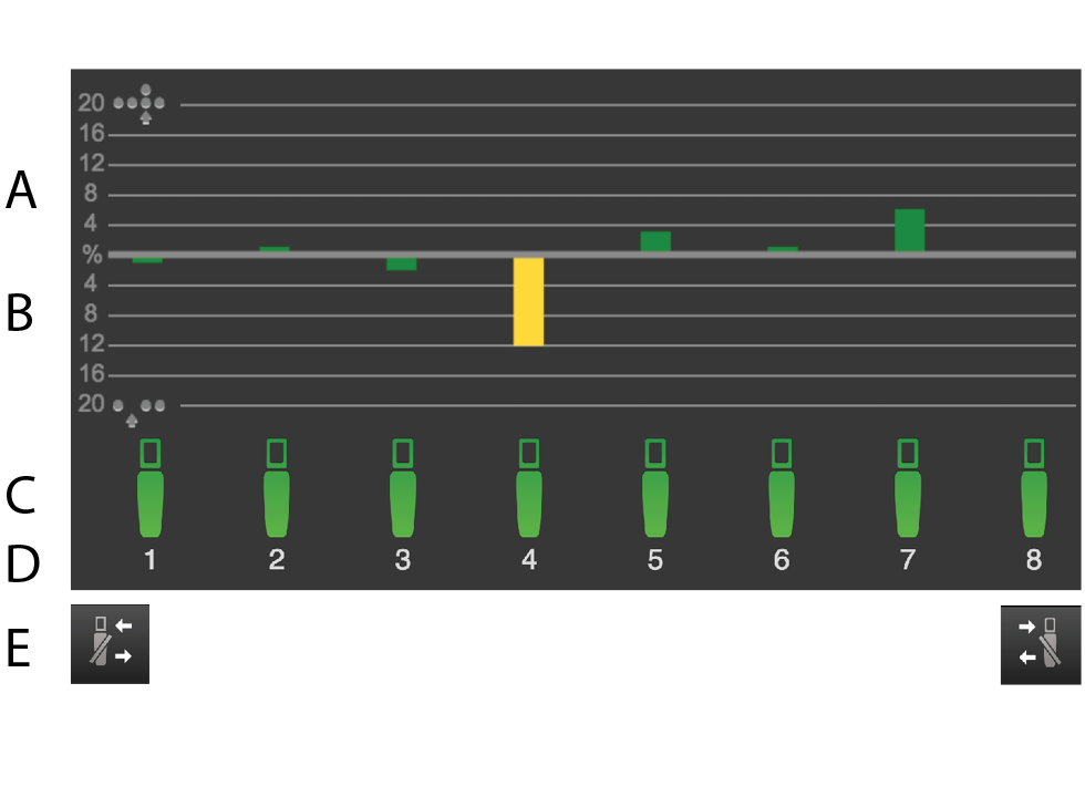 A bar chart is displayed for each row unit, which monitors the output. Status indication and a row unit number are also displayed.
