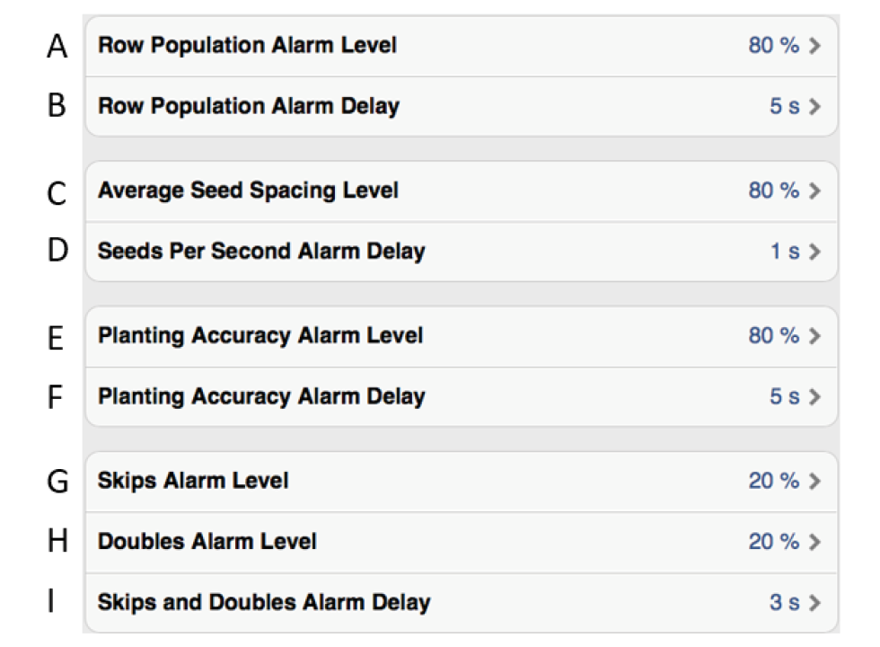 Planting accuracy alarm level. Generates an alarm if the planting accuracy for one of the row units is less than the set alarm level.