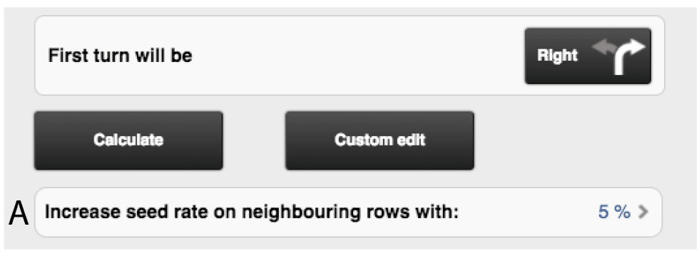 Tramlining Compensation is a function that allows you to vary the feed rate using the tramline program. By entering a percentage in (A), all rows adjacent to a tramlining row will receive an increased feed rate, in accordance with the percentage entered.