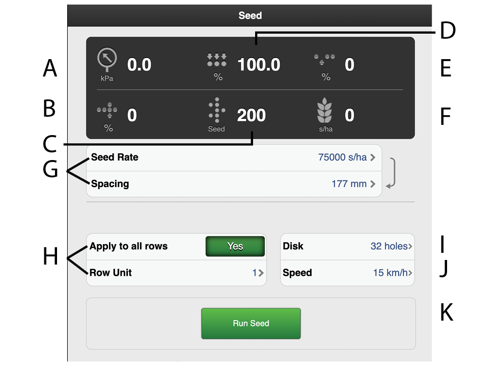 Start the fan; the value is shown in field (A). See Figure 1. Check that there is the right amount of air pressure (3.5 kPa) in the seed metering unit.