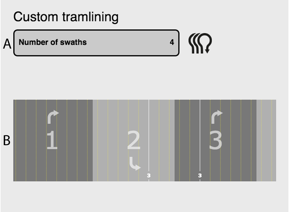 The yellow dotted lines in (B) display the row units that will sow and the white solid lines display the row units that will shutdown because of the tramlining.