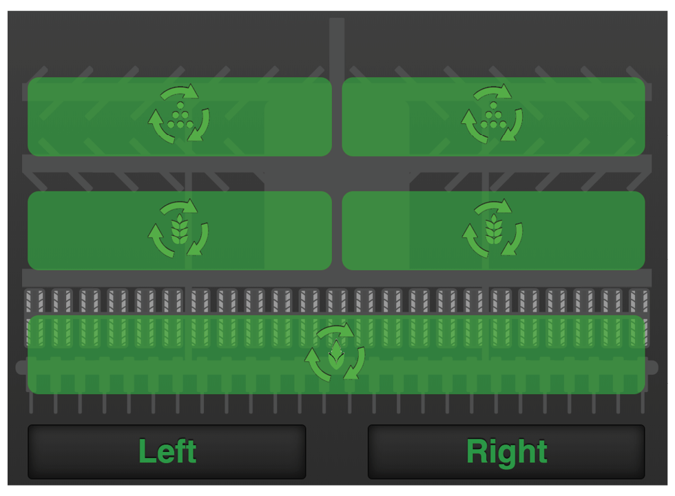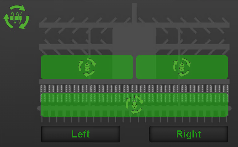 To shut off seed feed (seed and fertiliser, RDAC) on the left or right half of the machine, press the left or right button under the machine symbol on the home screen. Press the button again to restart the seed feed.